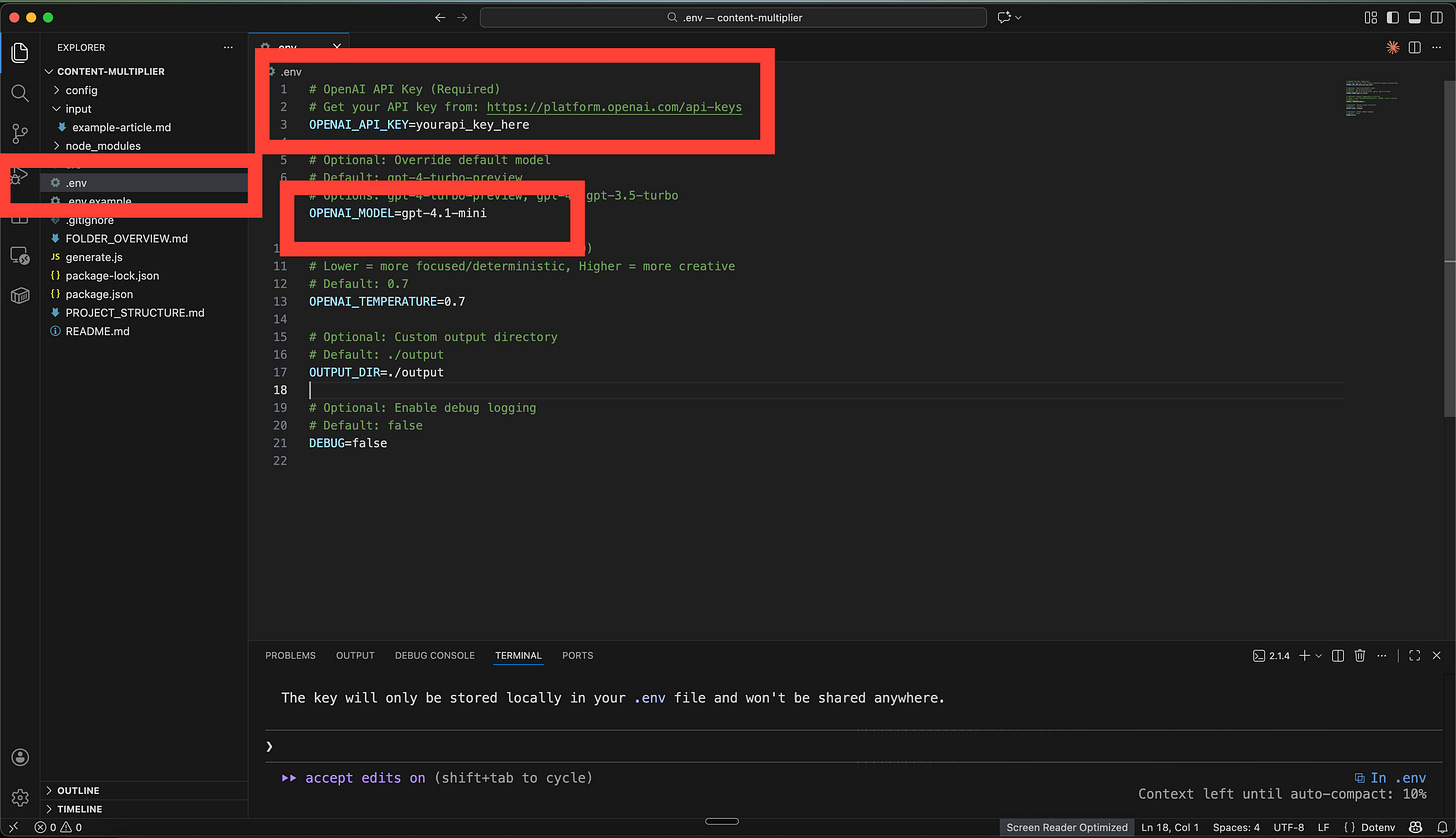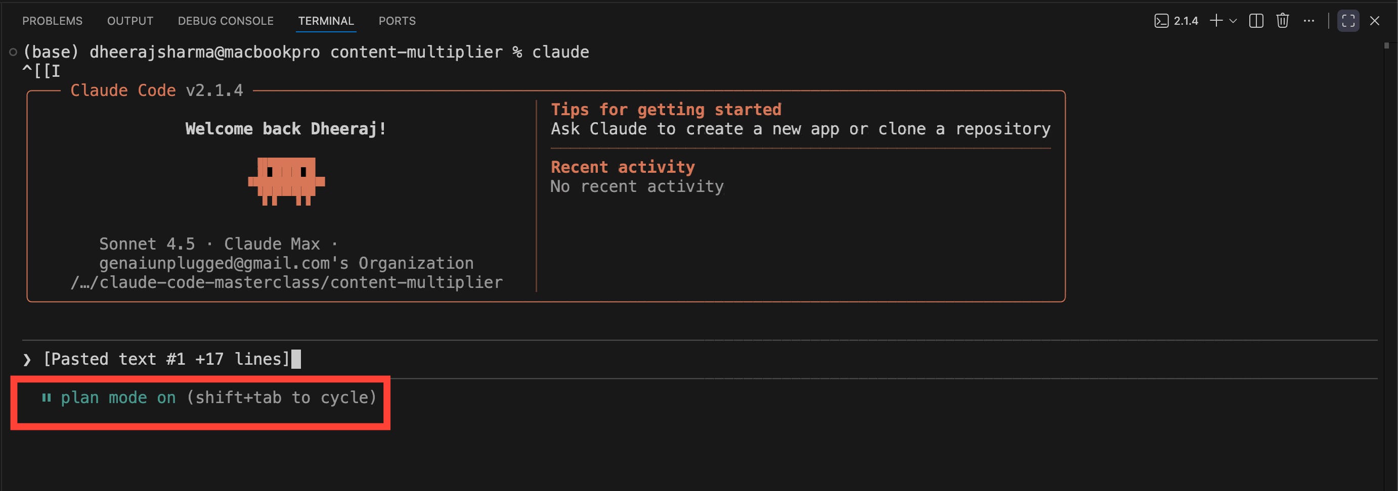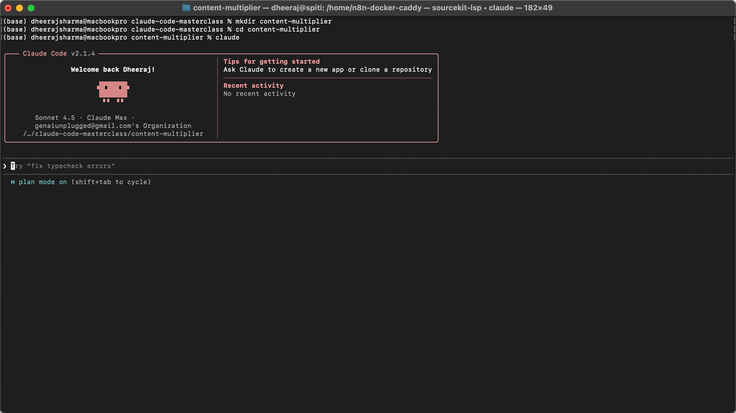 cd content-multiplierThis creates a dedicated folder for your content-multiplier system. Everything Claude Code builds will live here for this system.