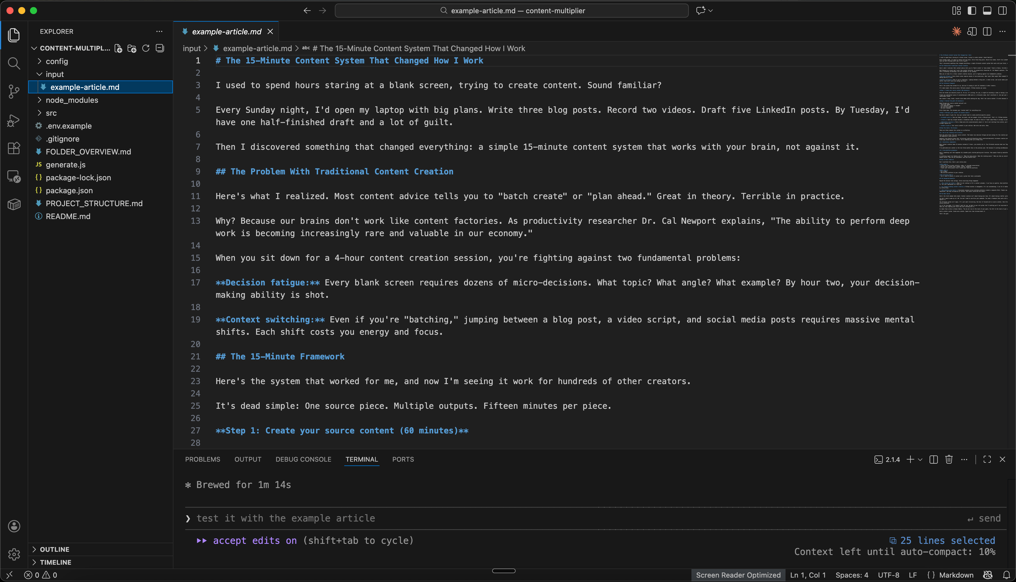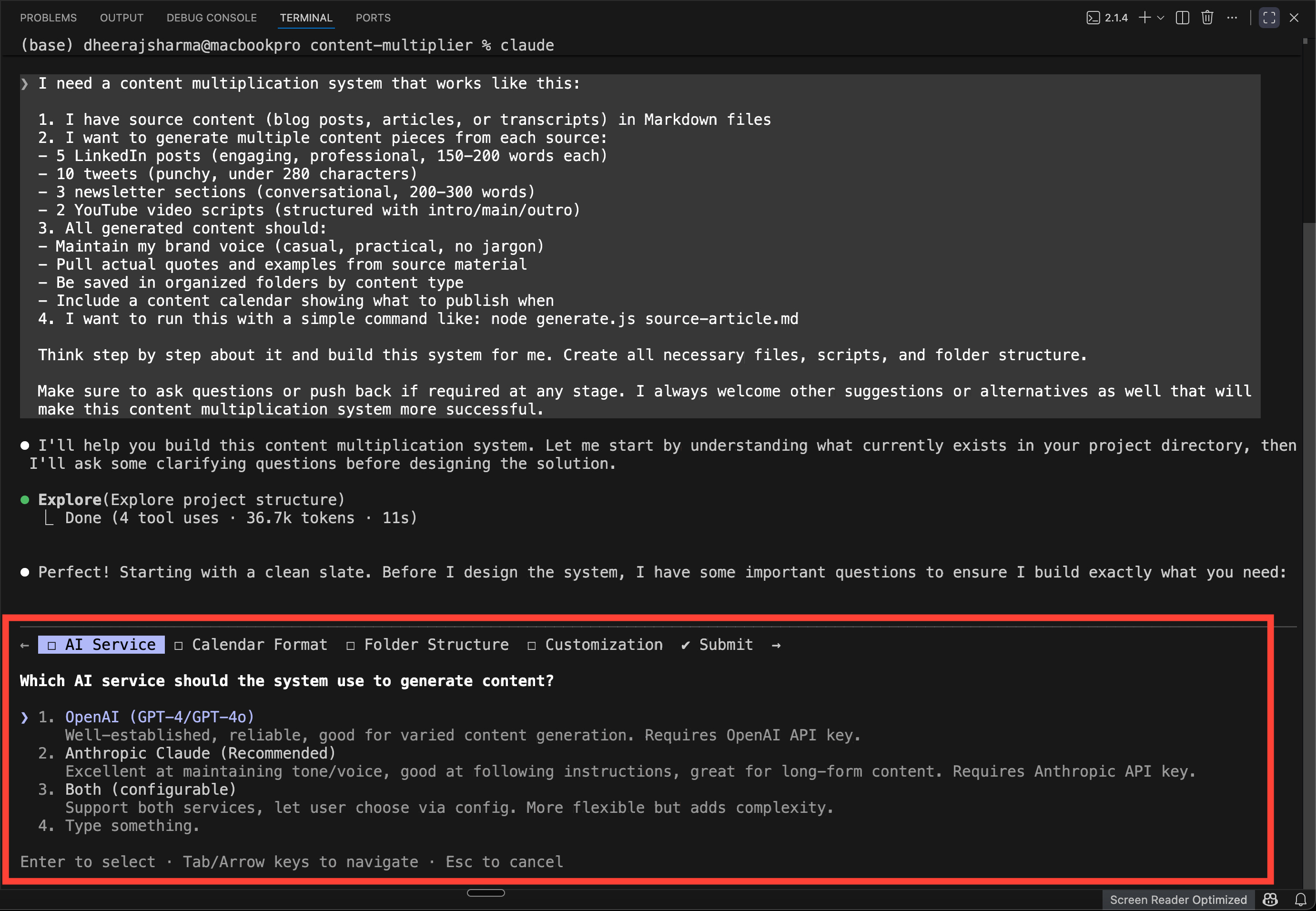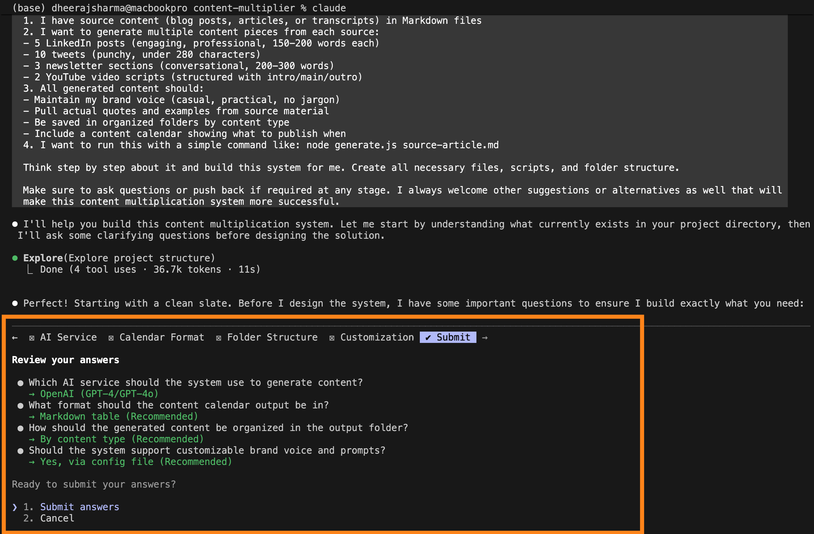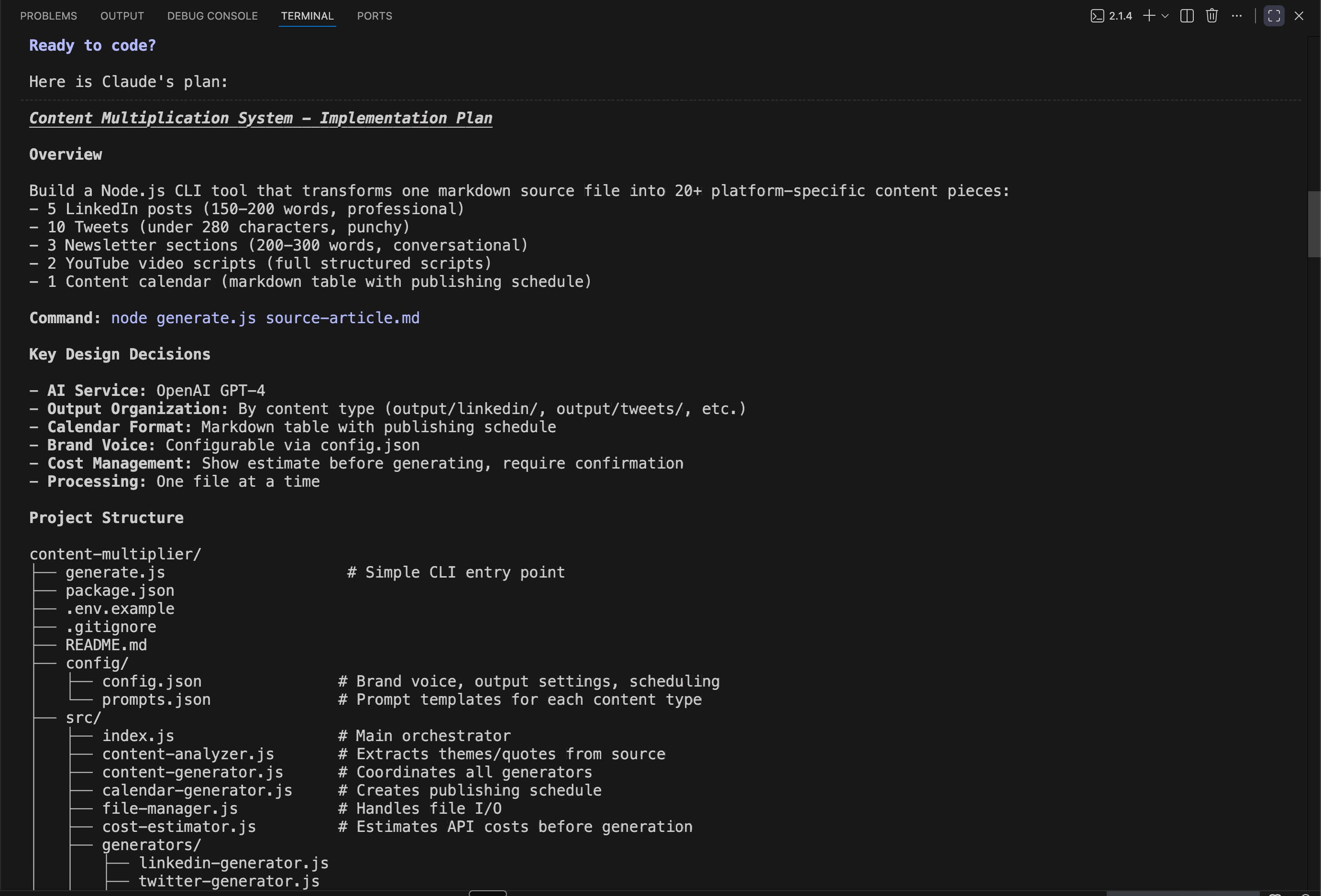 Here’s where the magic happens. You describe your content workflow in plain English, and Claude Code writes all the code.