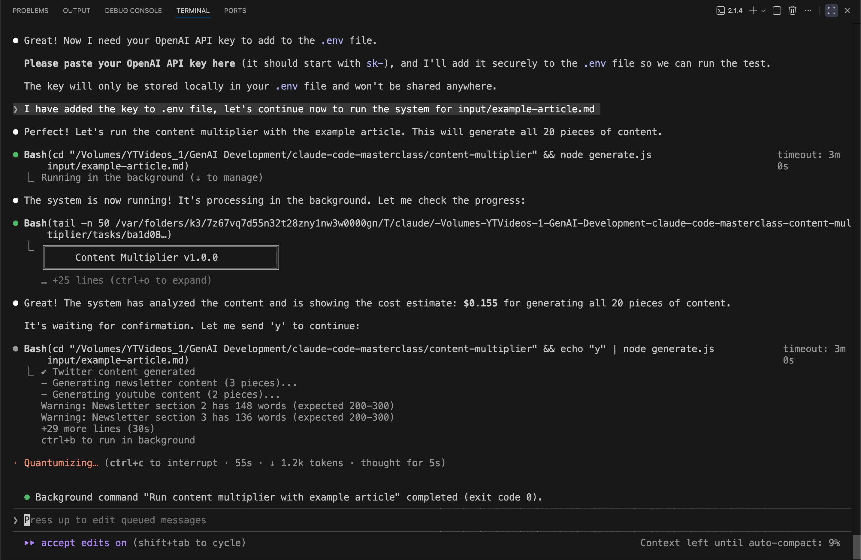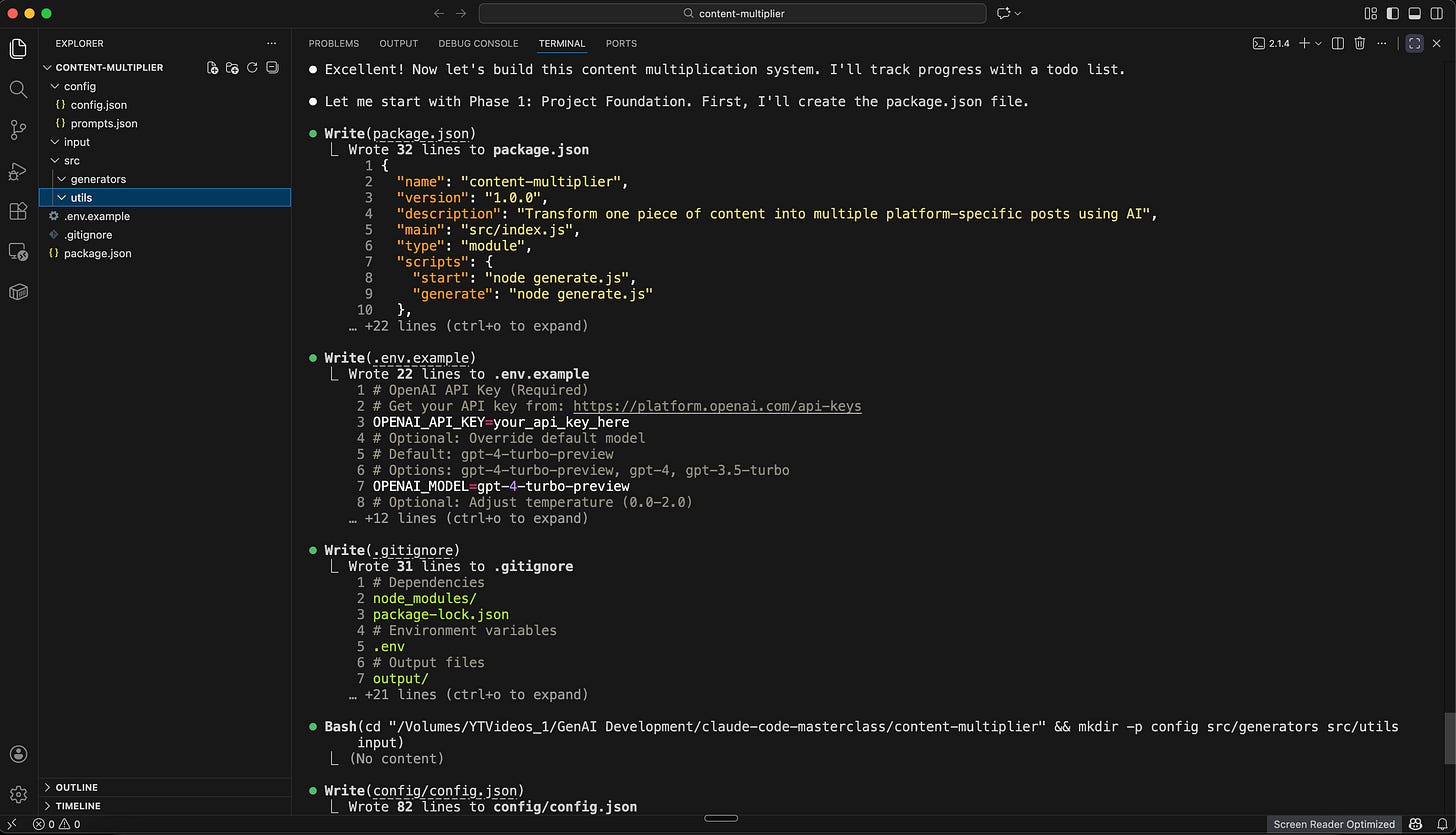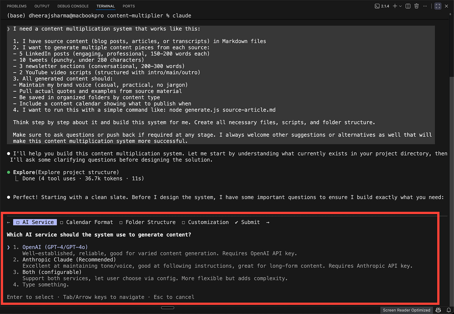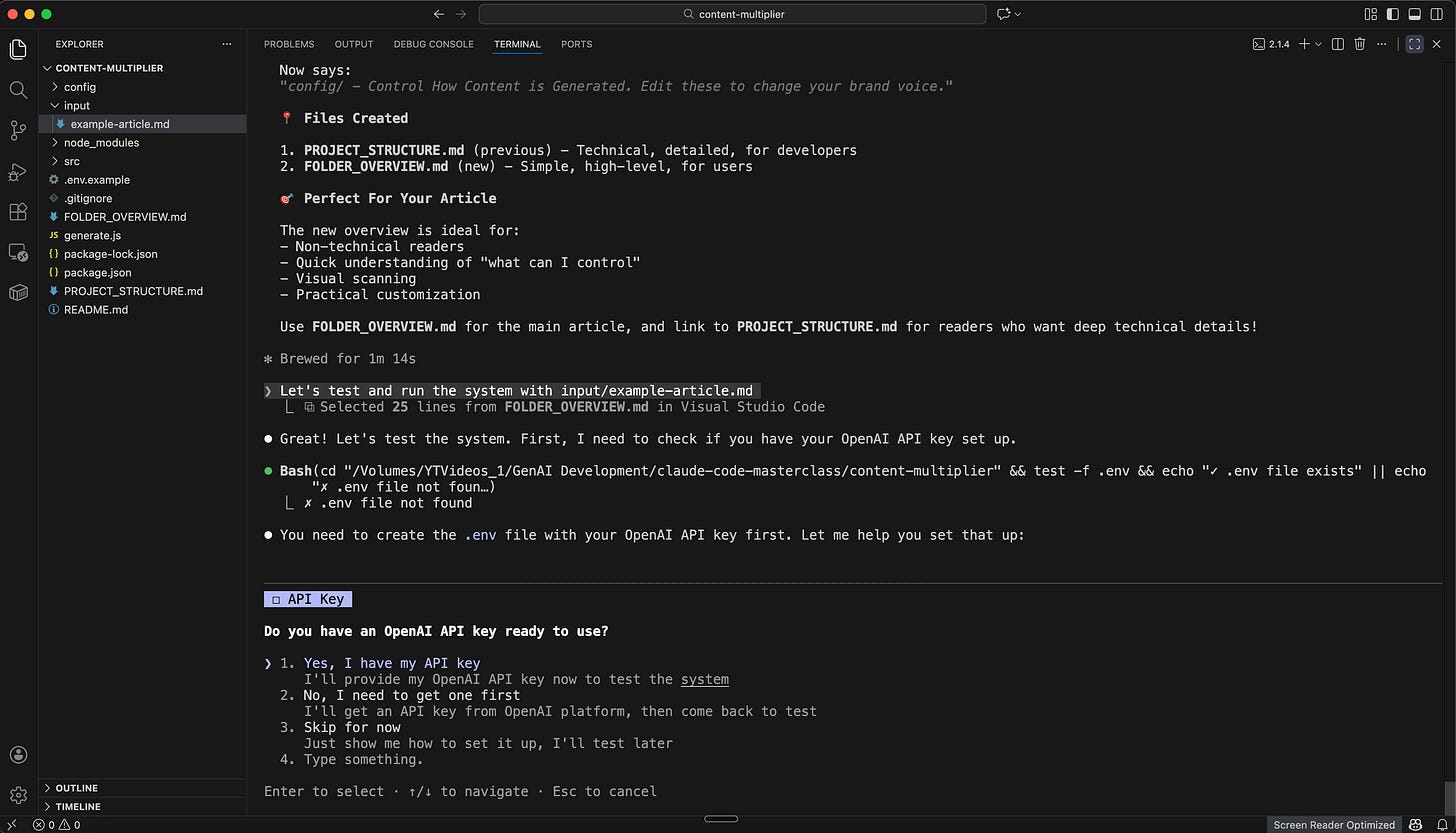 Here’s where the magic happens. You describe your content workflow in plain English, and Claude Code writes all the code.