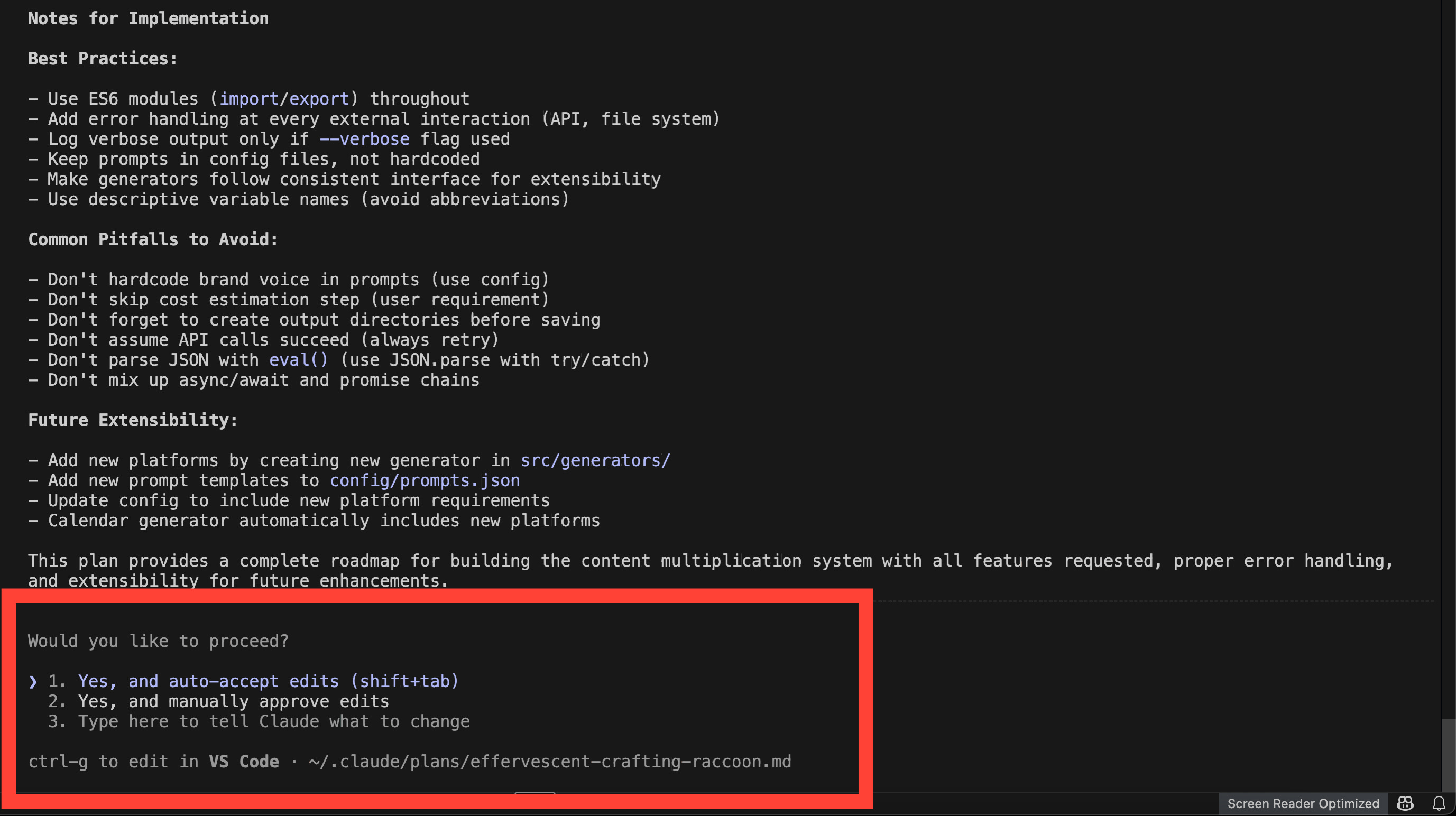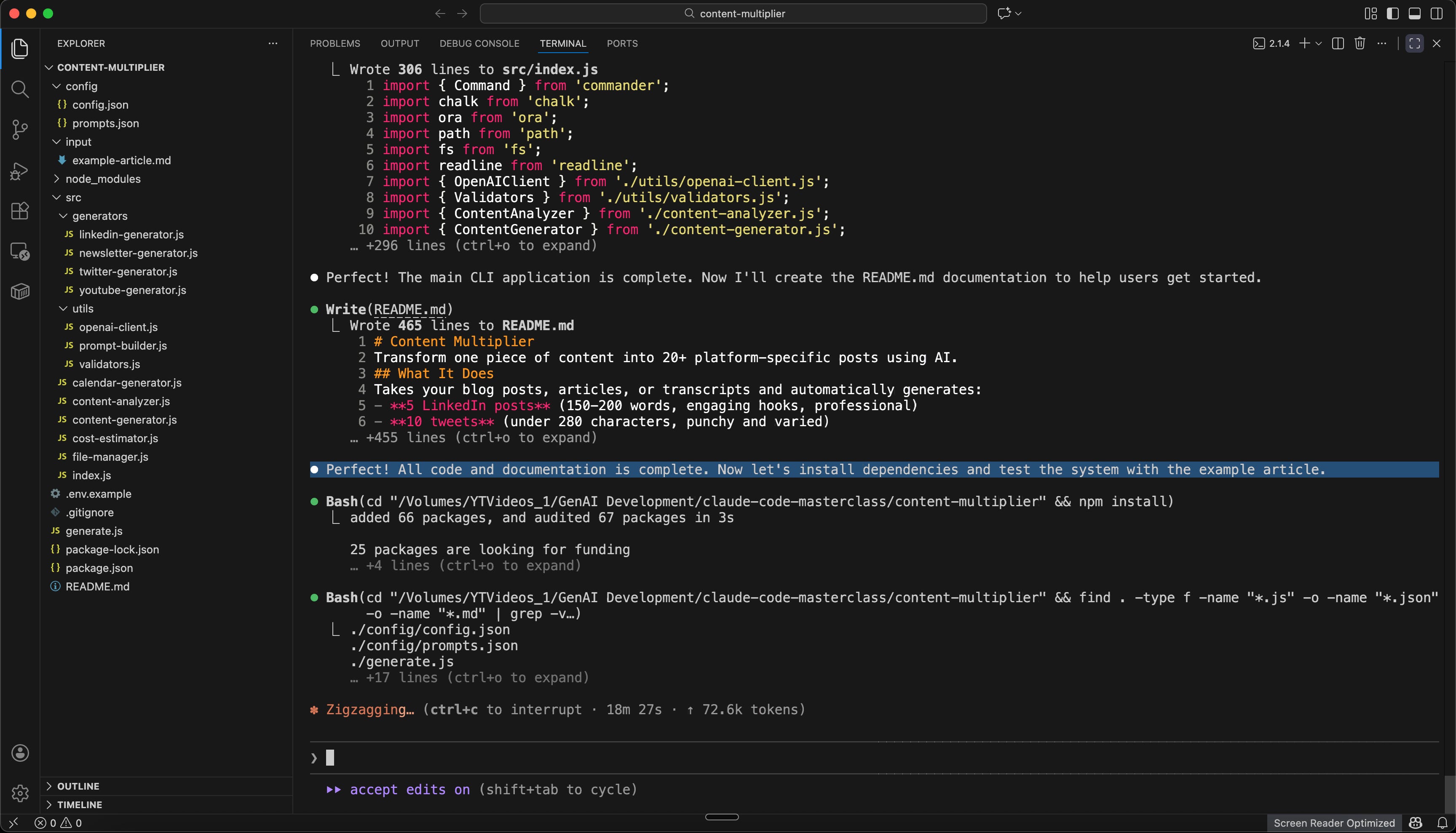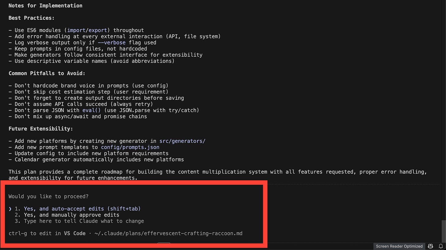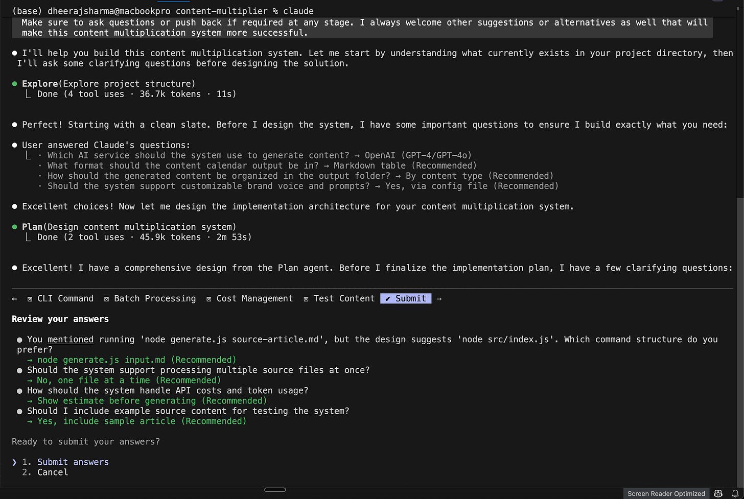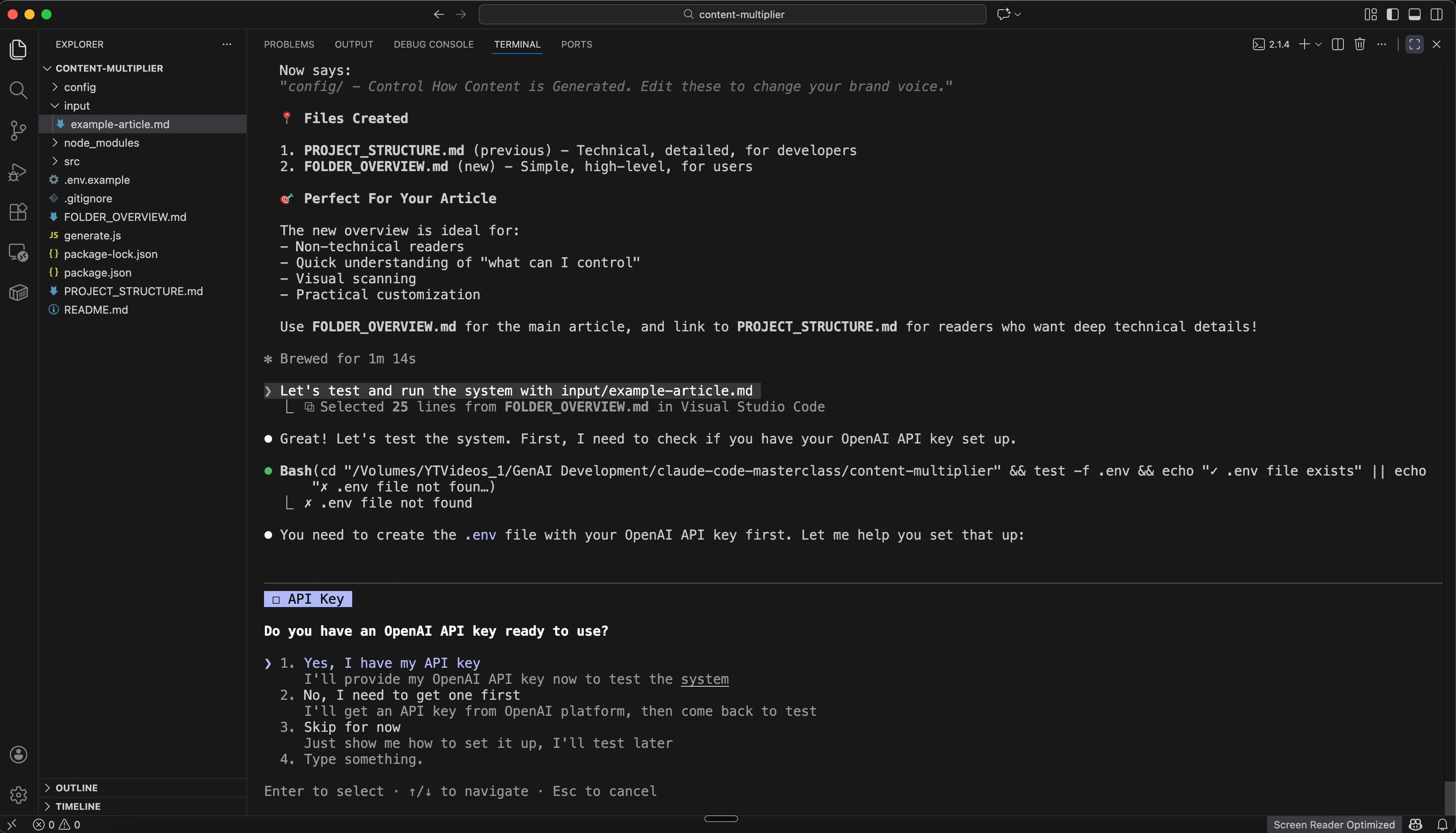 Here’s where the magic happens. You describe your content workflow in plain English, and Claude Code writes all the code.
