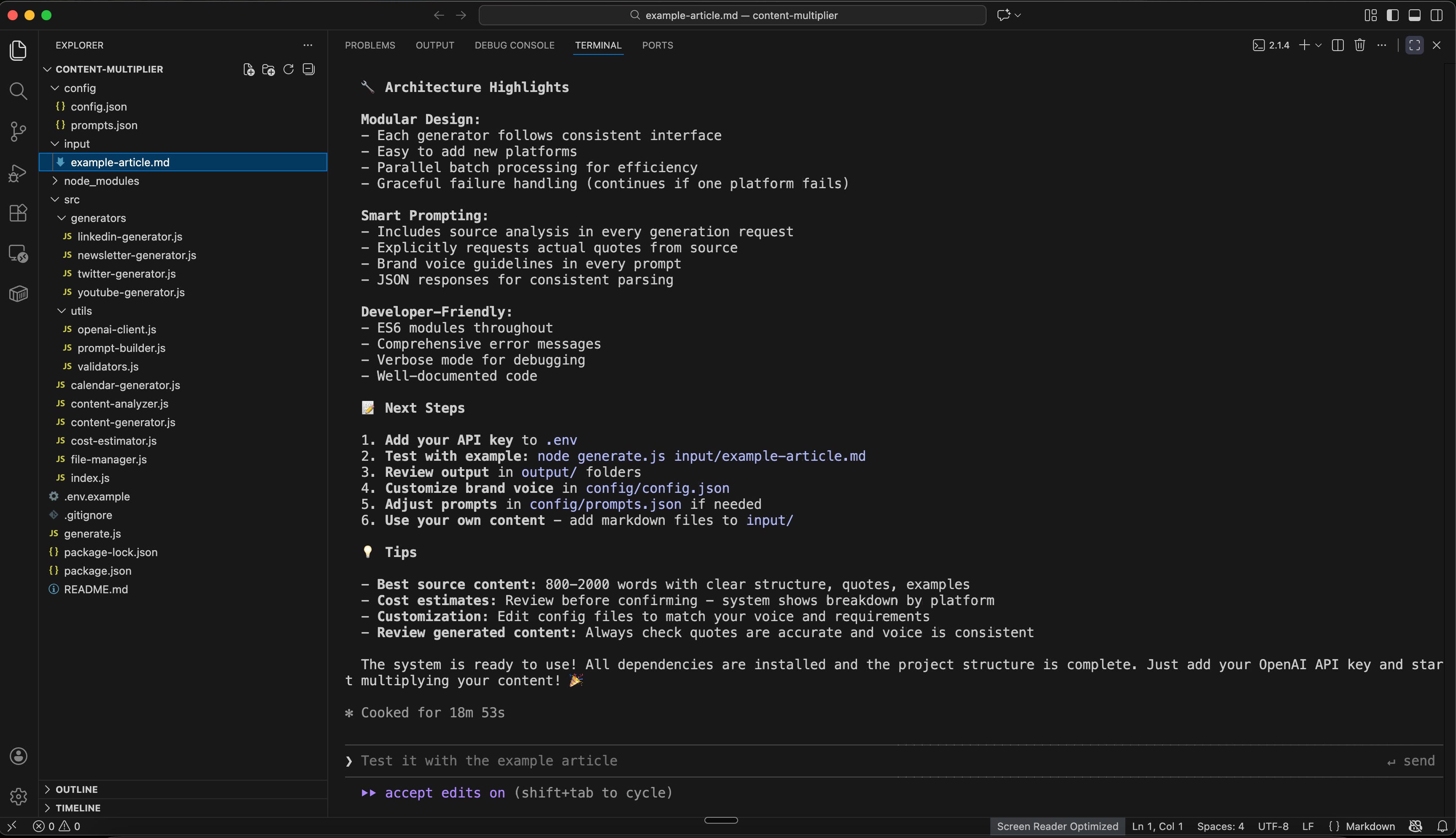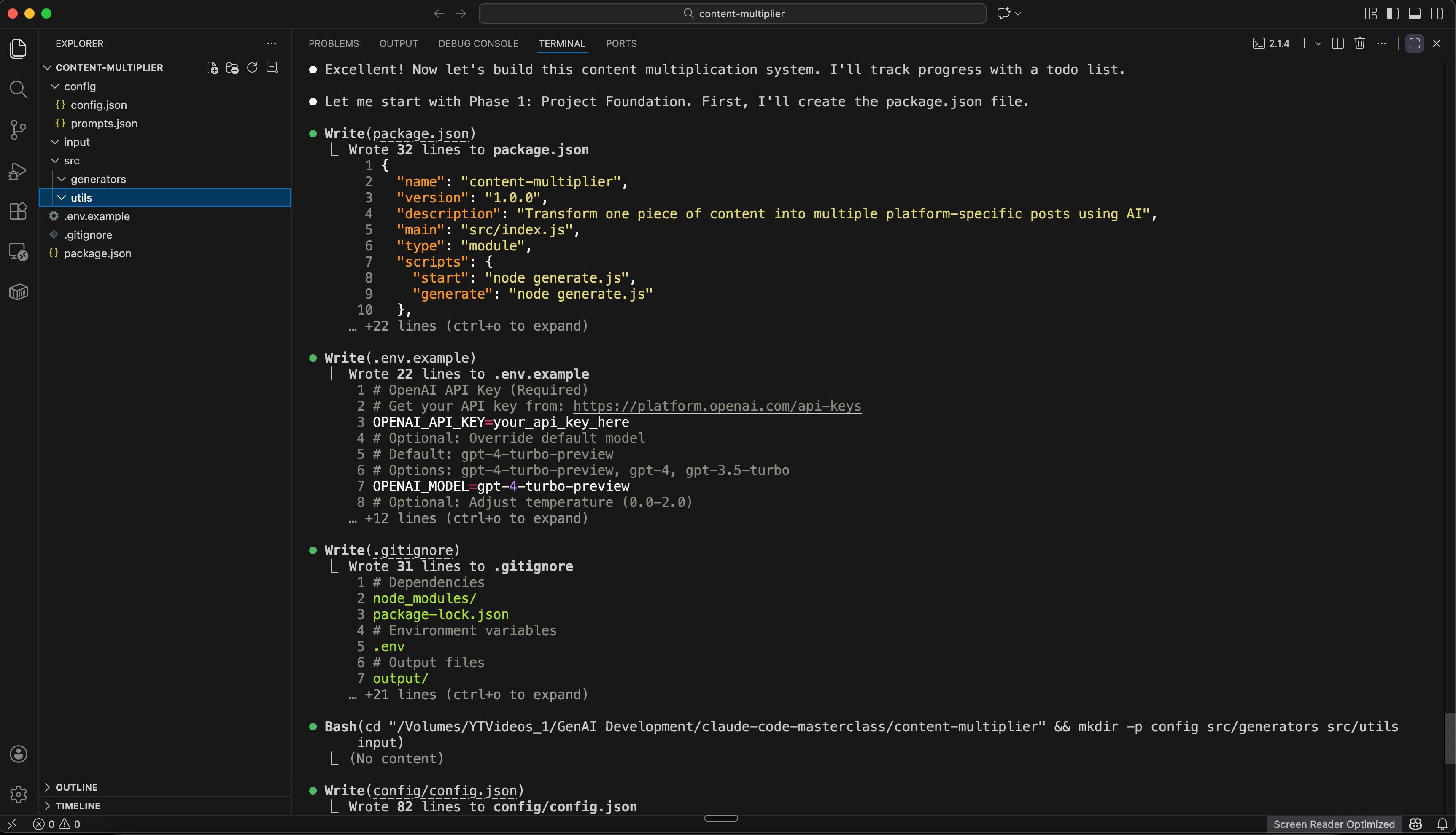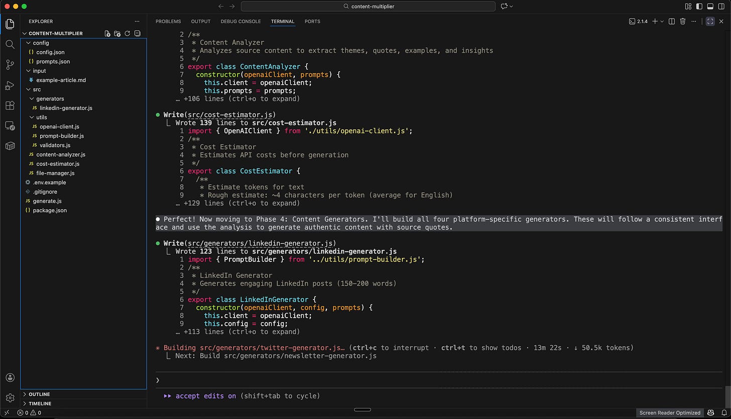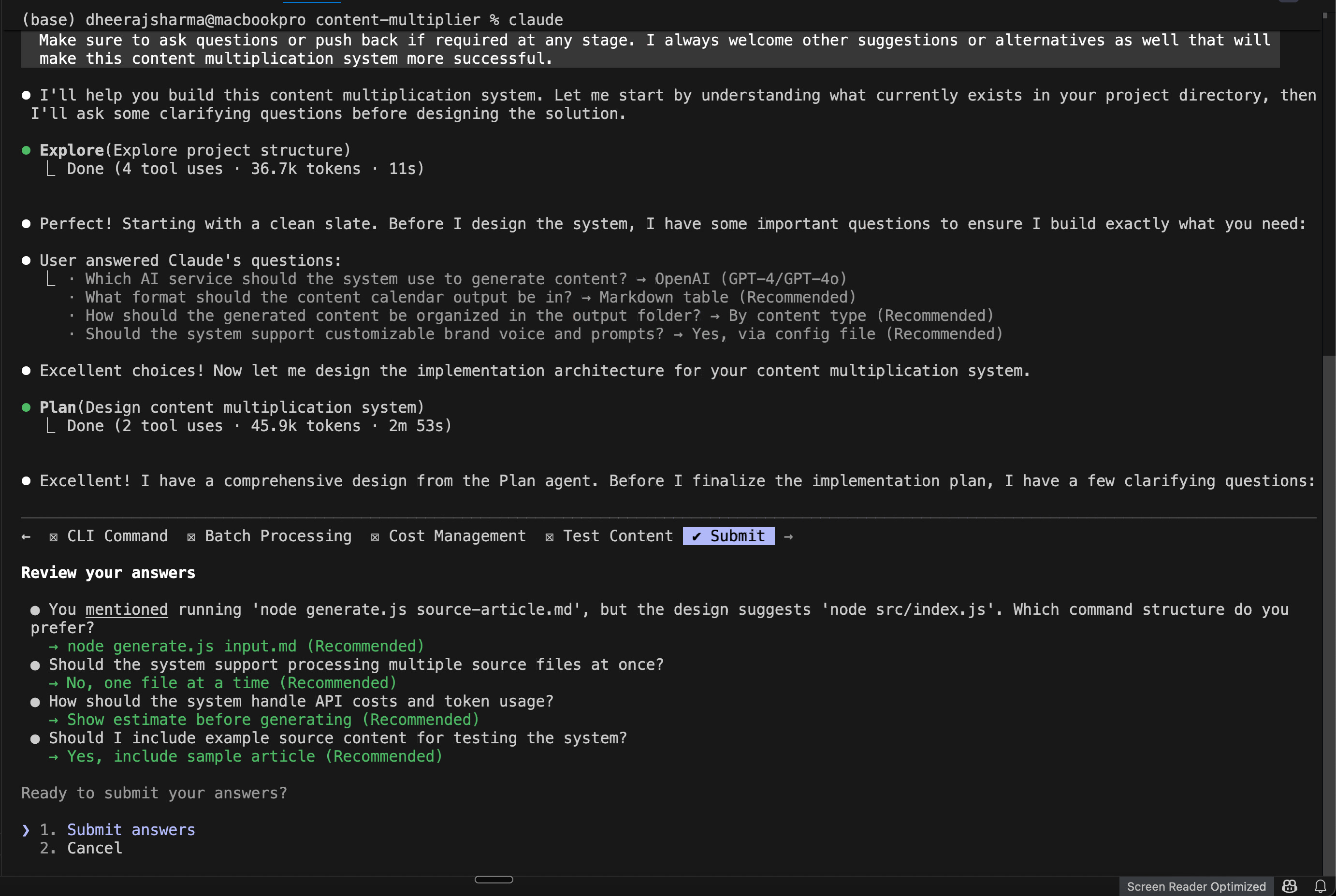 Here’s where the magic happens. You describe your content workflow in plain English, and Claude Code writes all the code.