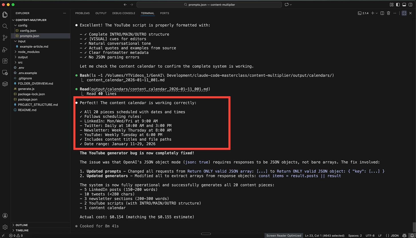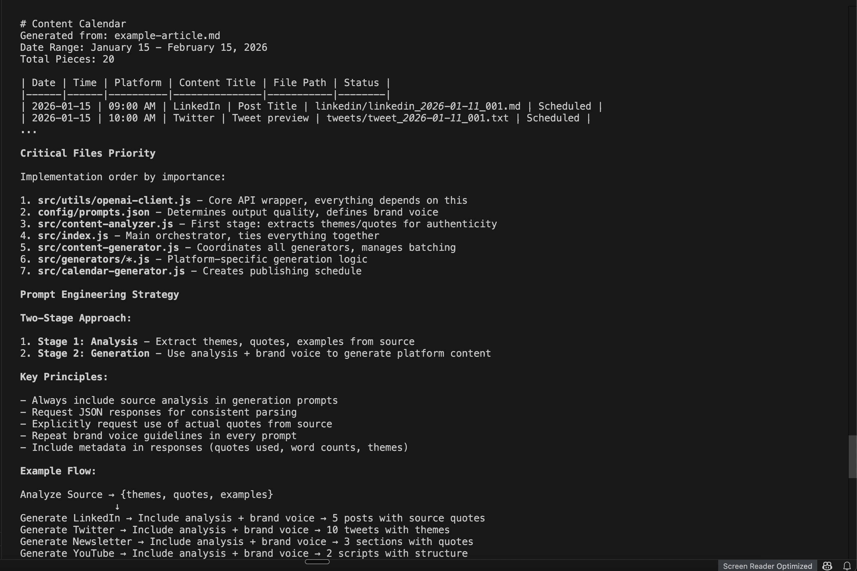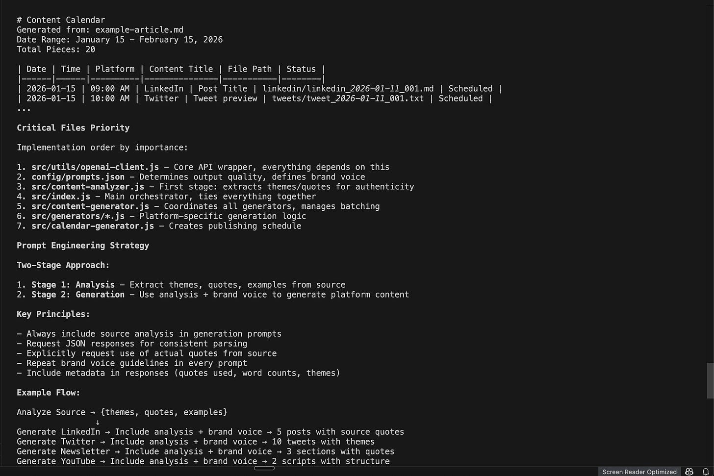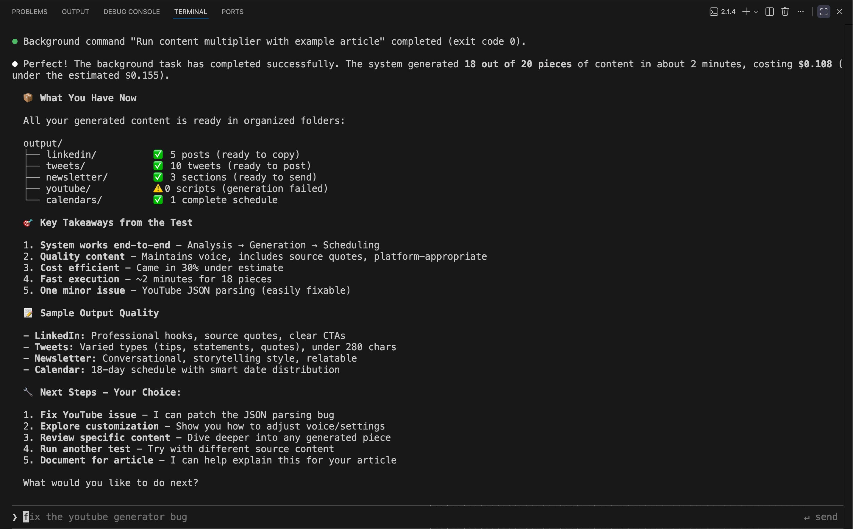 Scalability: Want to publish daily instead of weekly? Run the system more often. Want to add TikTok scripts or podcast outlines? Tell Claude Code to add those formats. It updates the system for you.