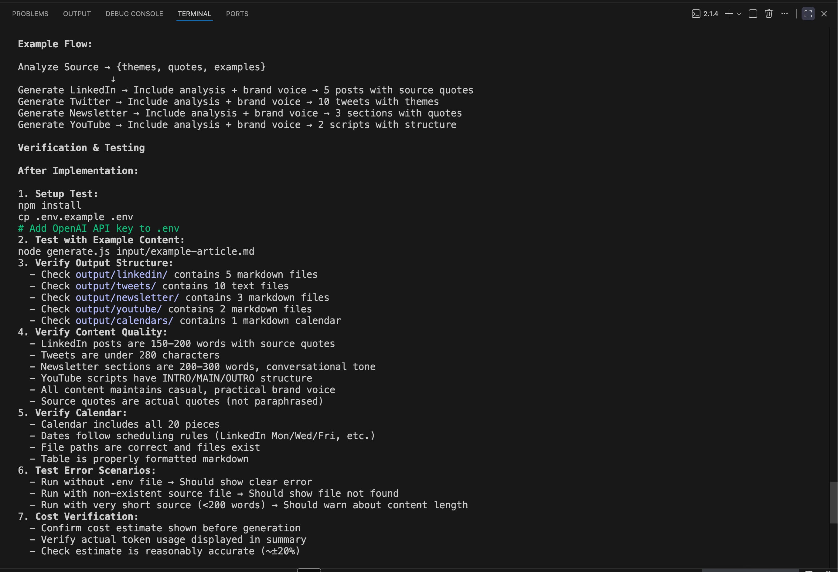 Claude Code takes your same brand voice principles and automates the multiplication. You describe your workflow once, Claude Code builds the system, and you run it whenever you need content.