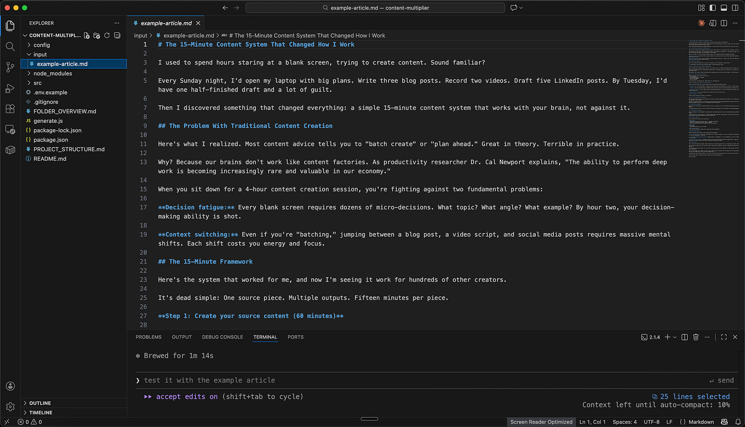 This article shows you how to build a content multiplication engine using Claude Code. You’ll describe your workflow in plain English, Claude Code writes all the scripts, and you end up with a system that turns one article into 10+ content pieces in the time it used to take to write one social post.