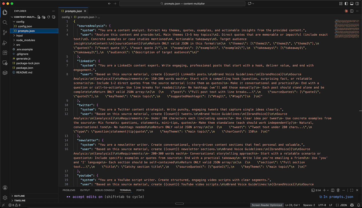 Open the prompts/ folder and edit any template file. Change the word count, tone instructions, or structure requirements. Save the file and ask Claude code to use updated prompts for your next batch. You don’t need to modify the JavaScript code.
