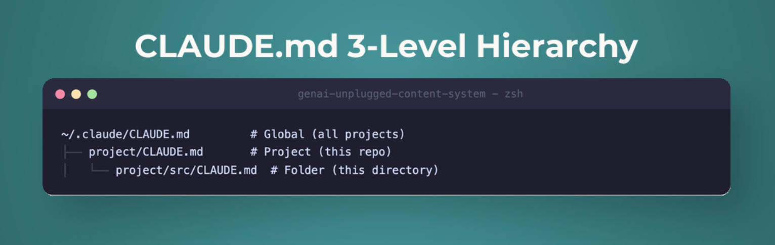 CLAUDE.md works at three levels, and this matters more than most tutorials acknowledge:
