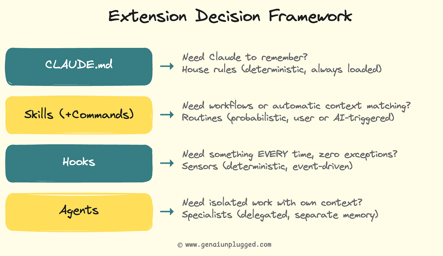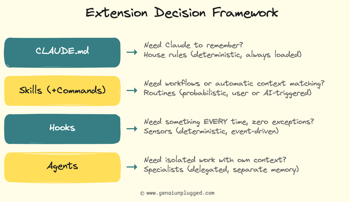 The decision framework - Claude Skills v/s Commands v/s Agents v/s Hooks