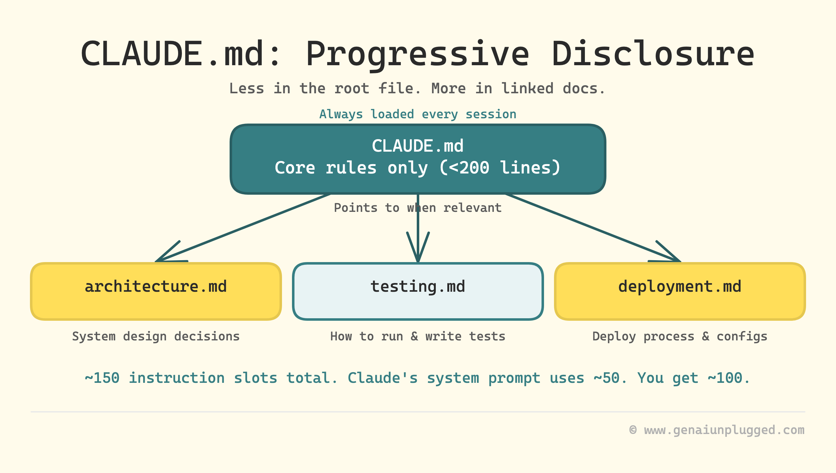 CLAUDE.md should be short and specific. Claude Code’s system prompt already uses ~50 of your ~150-200 instruction slots. Every vague or irrelevant rule degrades attention to your critical rules. Keep the root file under 200 lines. Use progressive disclosure. Put detailed docs in separate files and point Claude to them. Add rules every time Claude makes a mistake, but trim what it ignores.