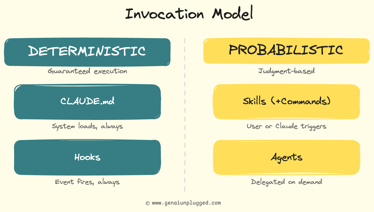 Skills and agents are probabilistic - Claude uses judgment about when and how to apply them.
