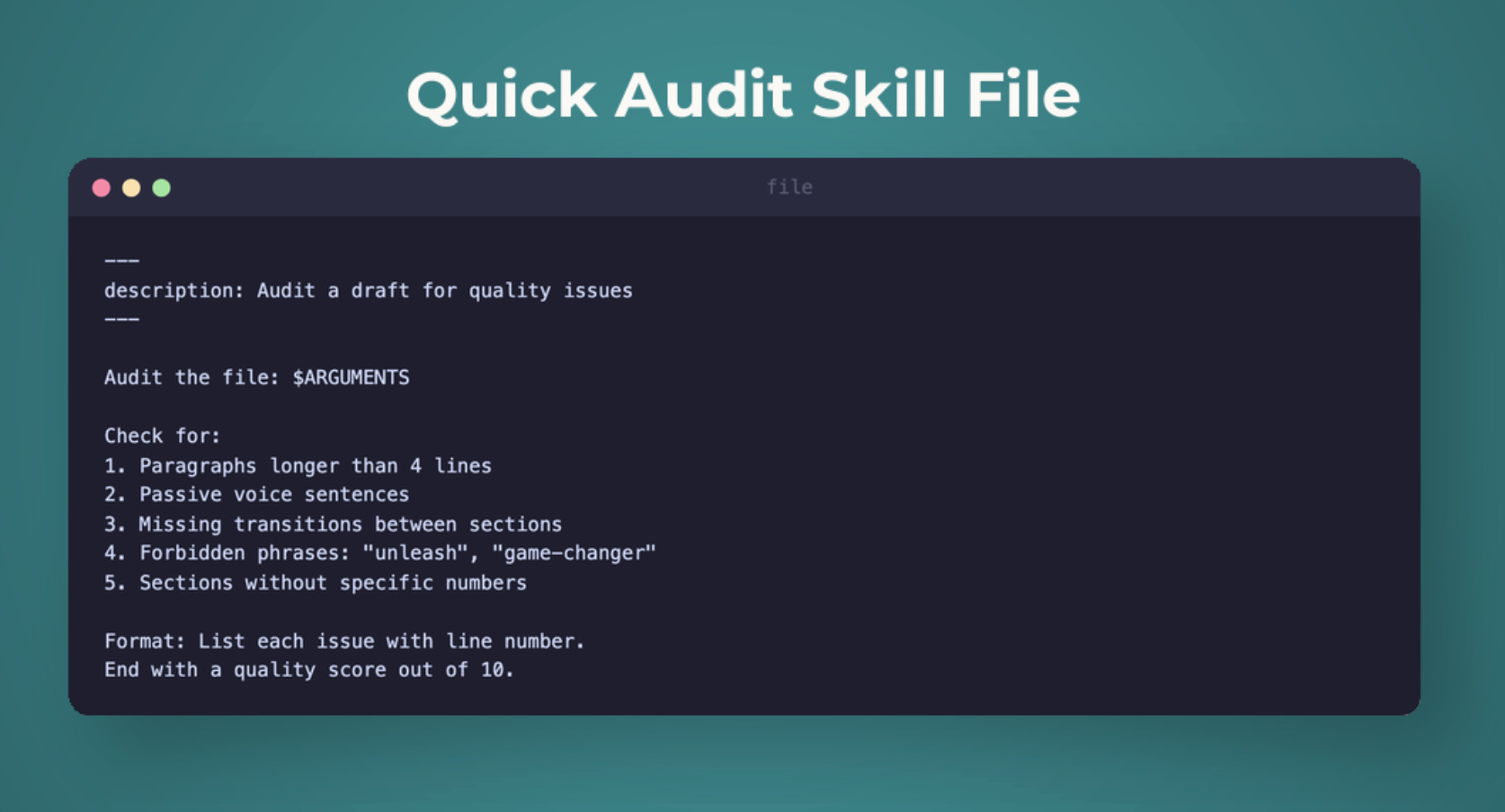 My first version of the brand-voice-check skill had a vague description: “Checks content quality for brand compliance.”