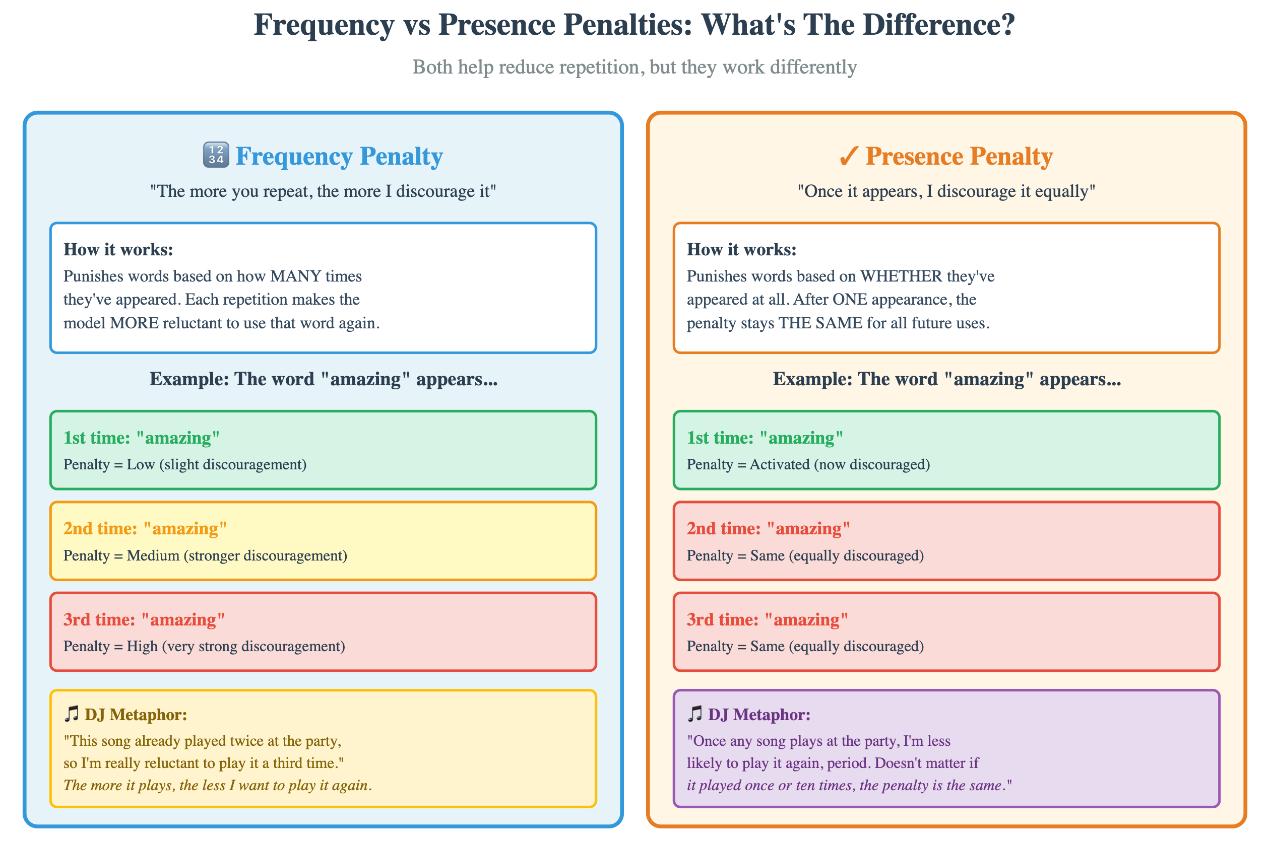These two settings help you reduce repetition in the LLM output. Think of them as rules for your DJ about playing songs multiple times during the party.