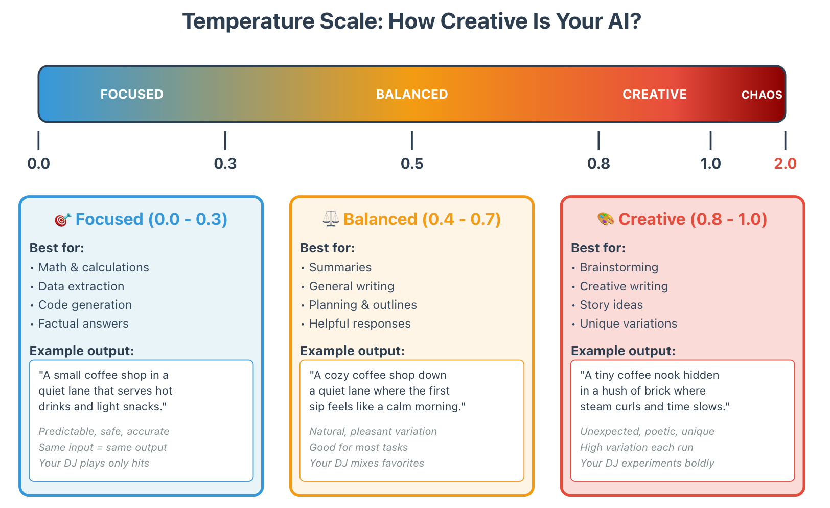 Temperature controls how adventurous the model is when picking the next token. The scale runs from 0.0 to 2.0, though values above 1.0 often produce unpredictable or nonsensical results and are rarely useful. Low temperature means careful and steady, while high temperature means creative and varied. The DJ analogy helps here. A cautious DJ plays the hits you expect, while a bold DJ mixes in fresh tracks.